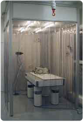Downflowoverkapping als schoonmaakruimte voor de ingang van de materiaalsluis van de cleanroom.